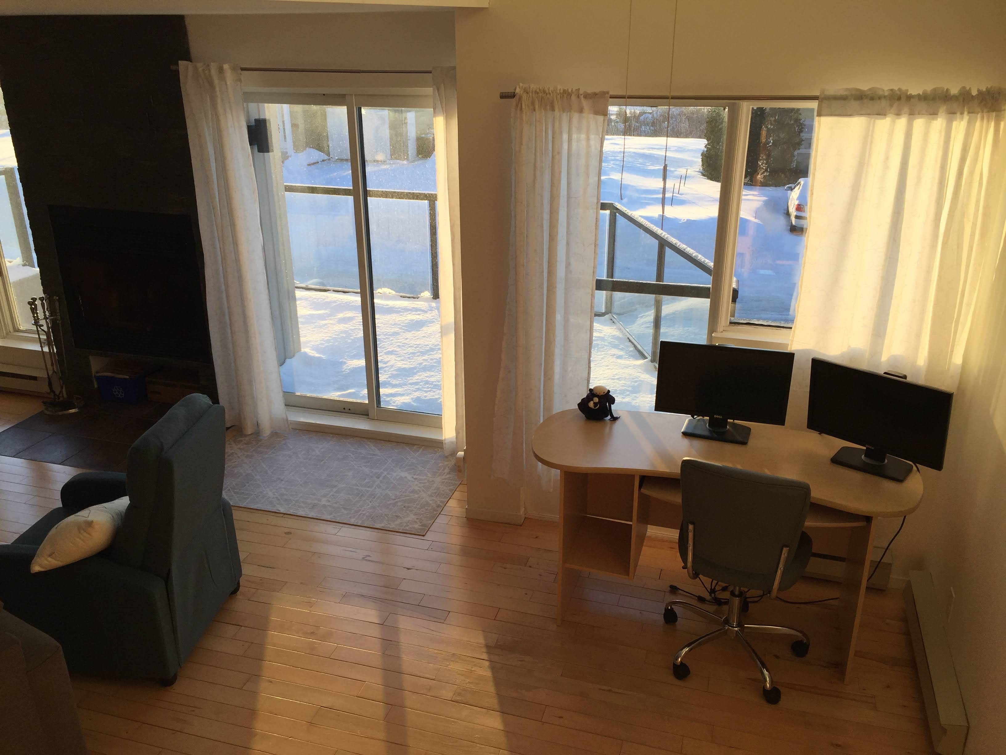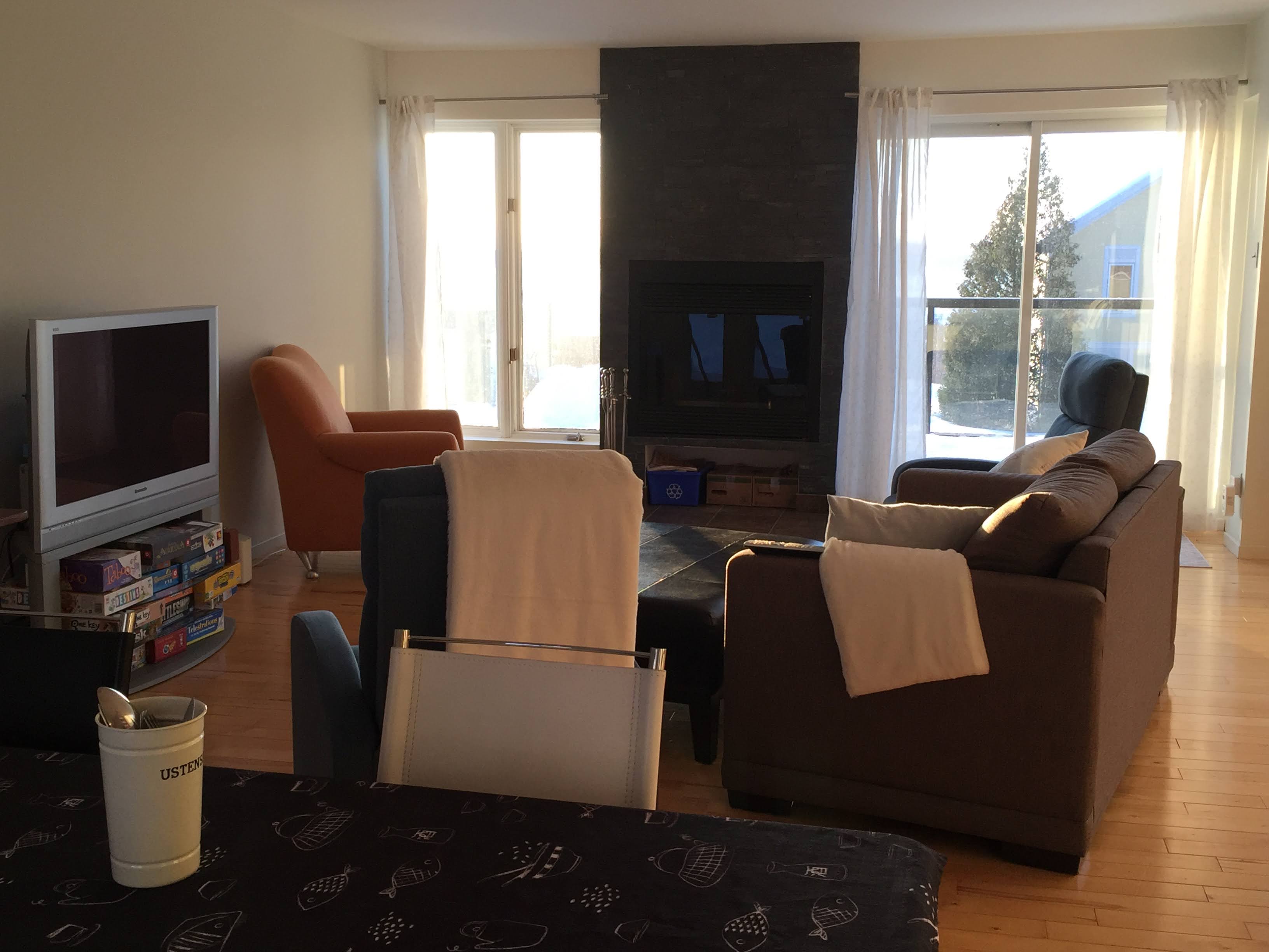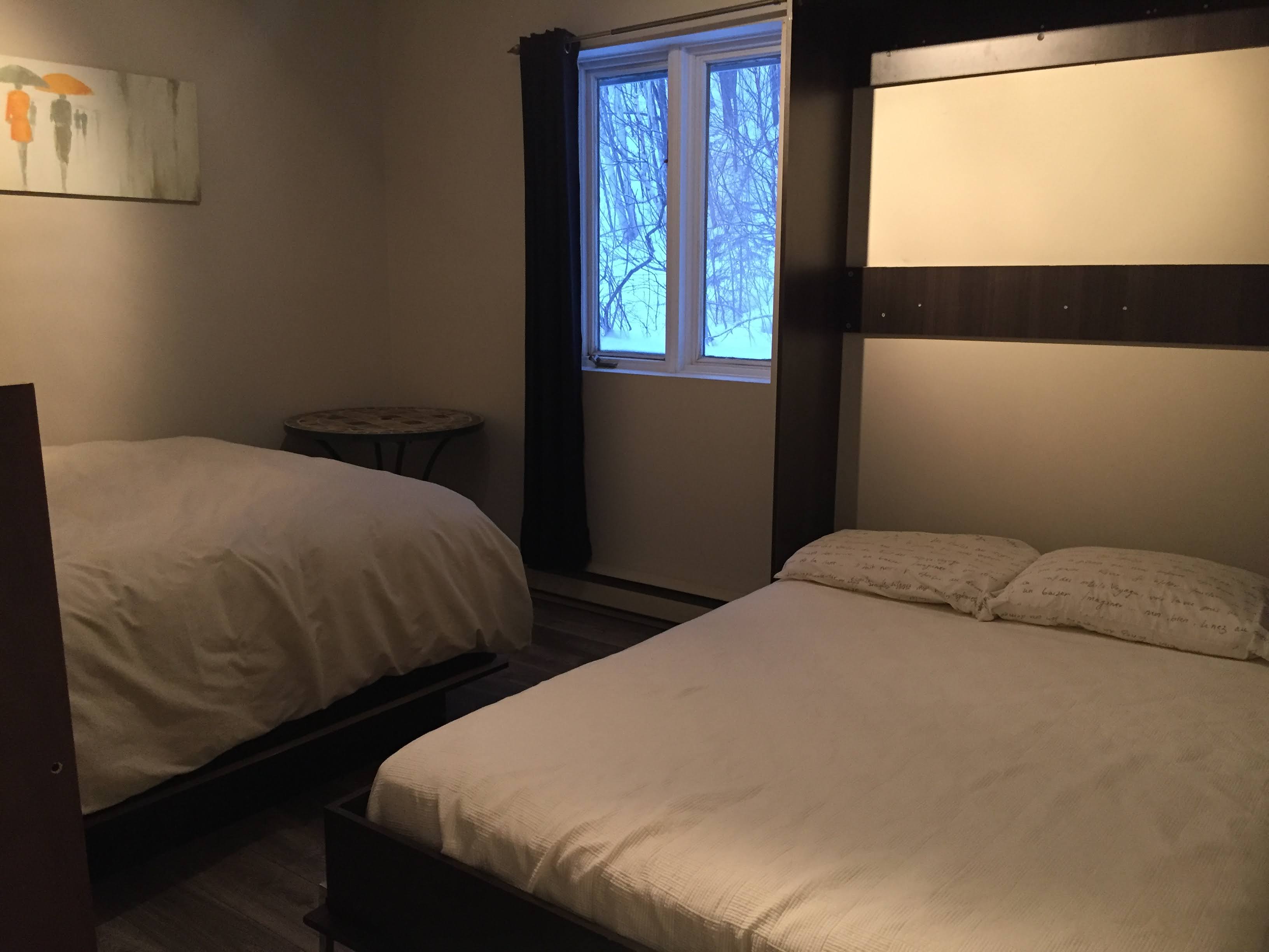 - Au 2e étage : chambre des maîtres avec espace bureau et lit queen, 2e chambre avec lit queen et lit double (escamotable), salle de bain.